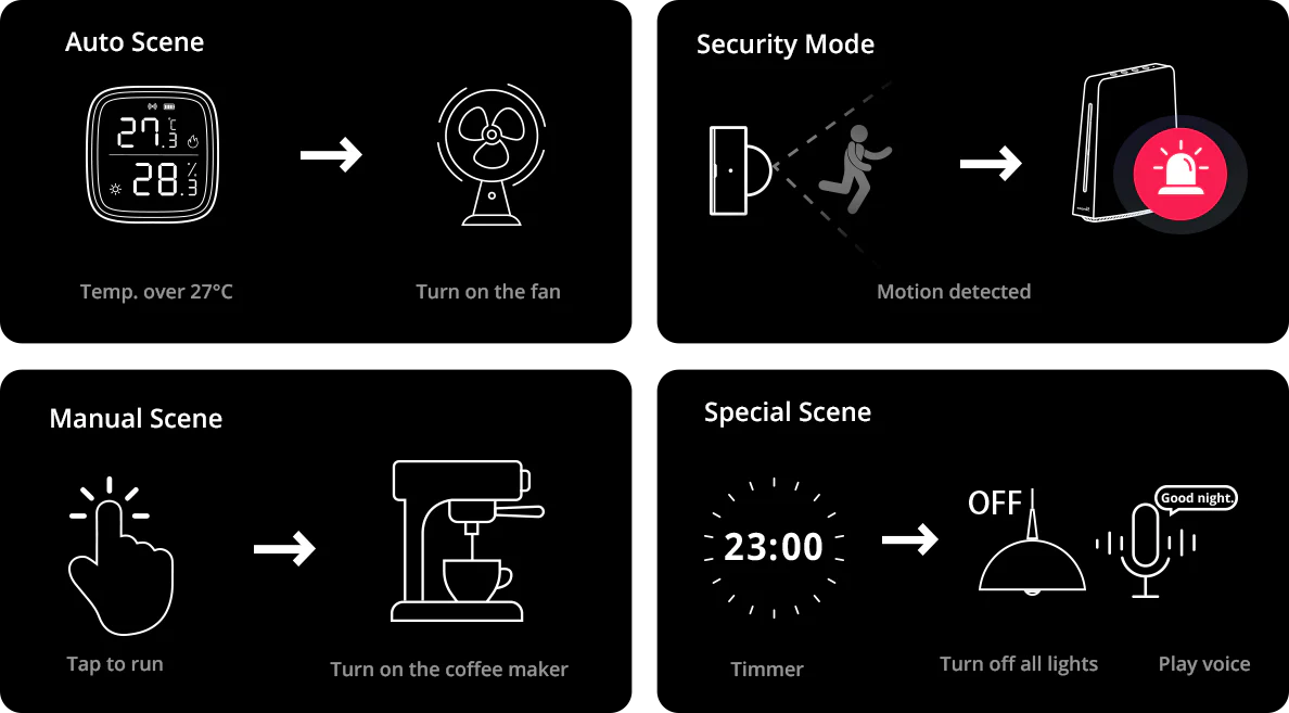 iHost supports settings local security modes and smart scenes. With software updates, it gradually unlocks more customizable capabilities.