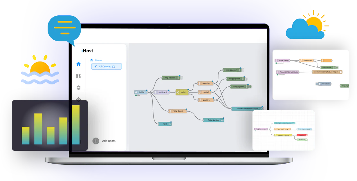 Install Node-RED Add-on in iHost to create scenes with more versatility. Weather triggers? Create data tables? Implement a wide range of scenes through third-party nodes.