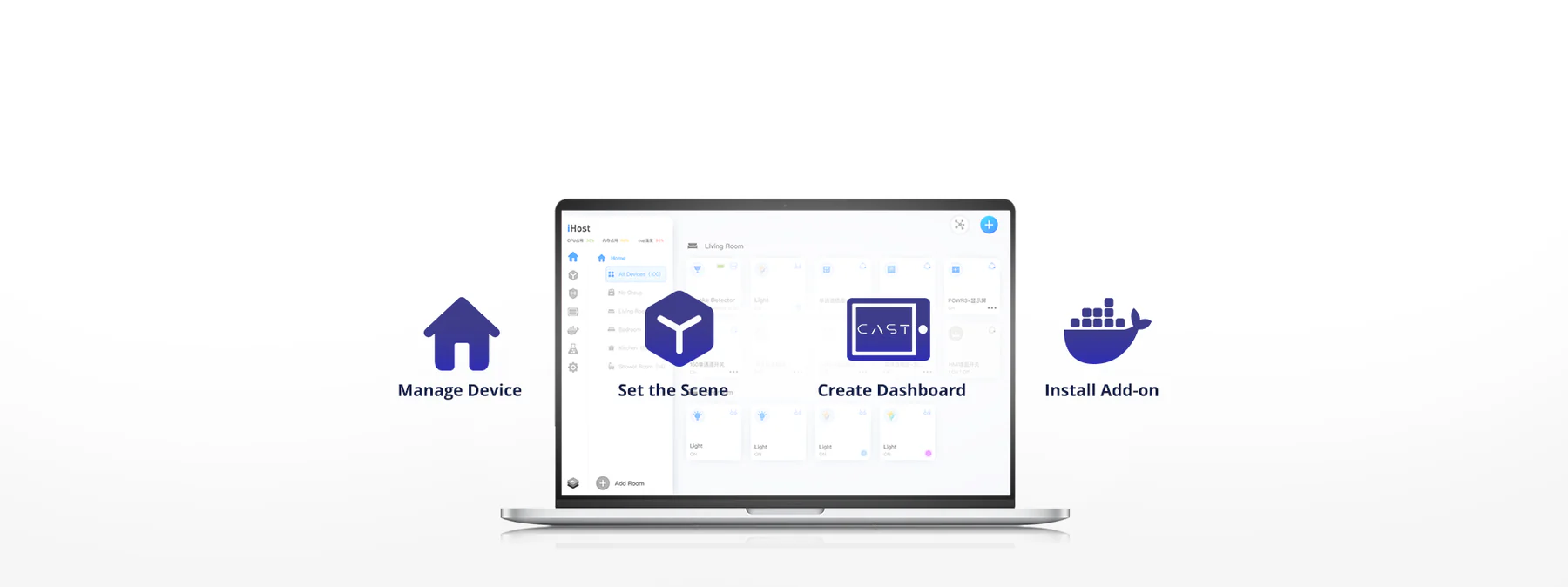 Access the iHost center console through a web browser, where manage devices, set up smart scenes, configure dashboards, and install Add-ons, among other features.