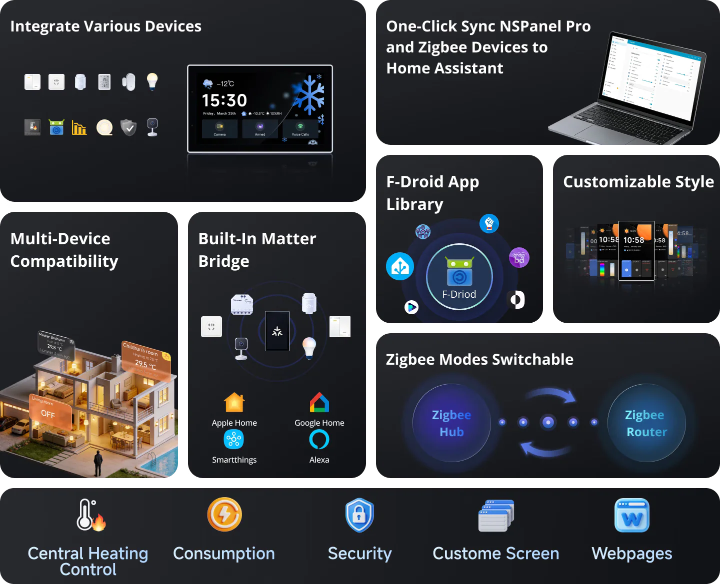 【Zigbee Hub Built-In】Add Zigbee devices in batches directly from the screen. With Zigbee 3.0 protocol, enjoy stable, wide-range connectivity. Sub-devices can be voice-controlled via Alexa, Google Home, and others.