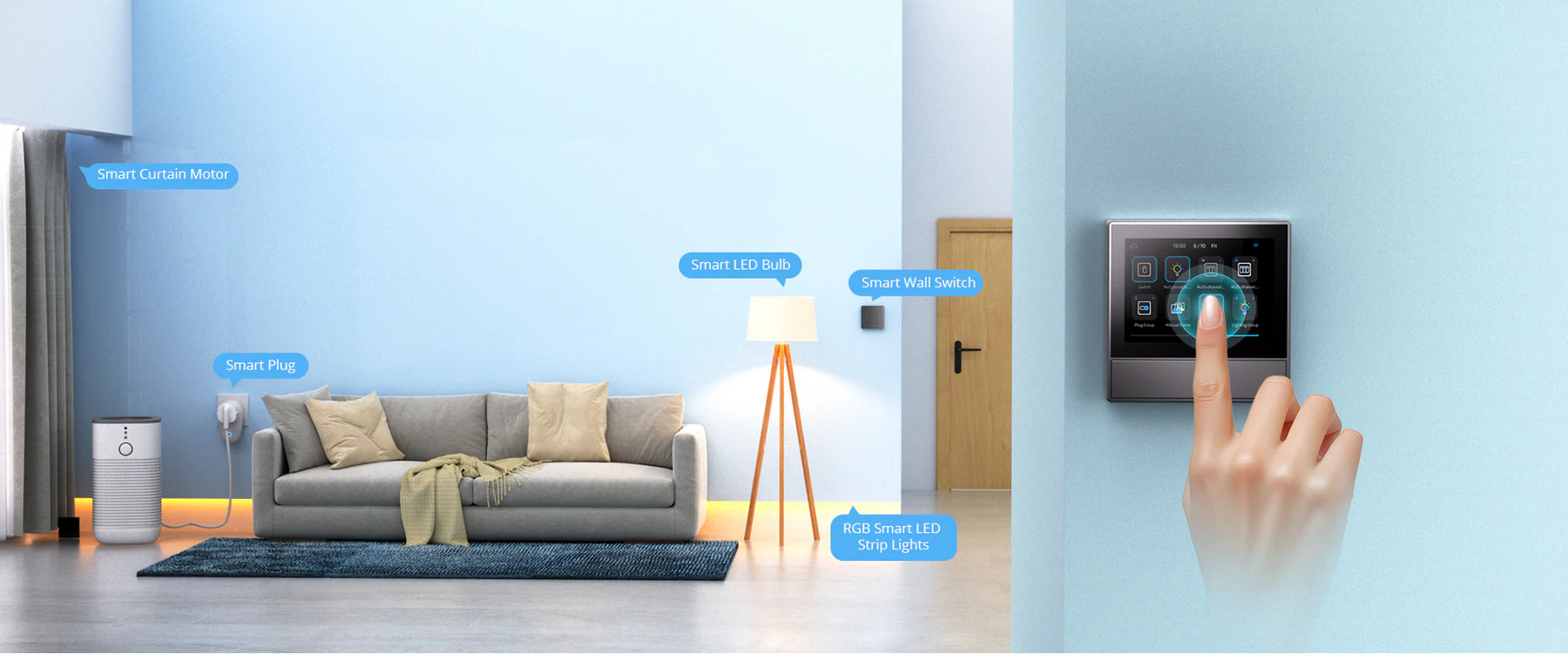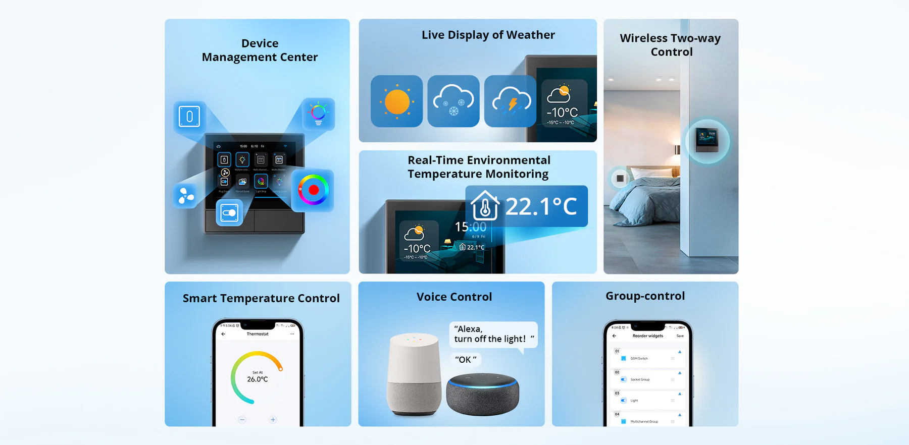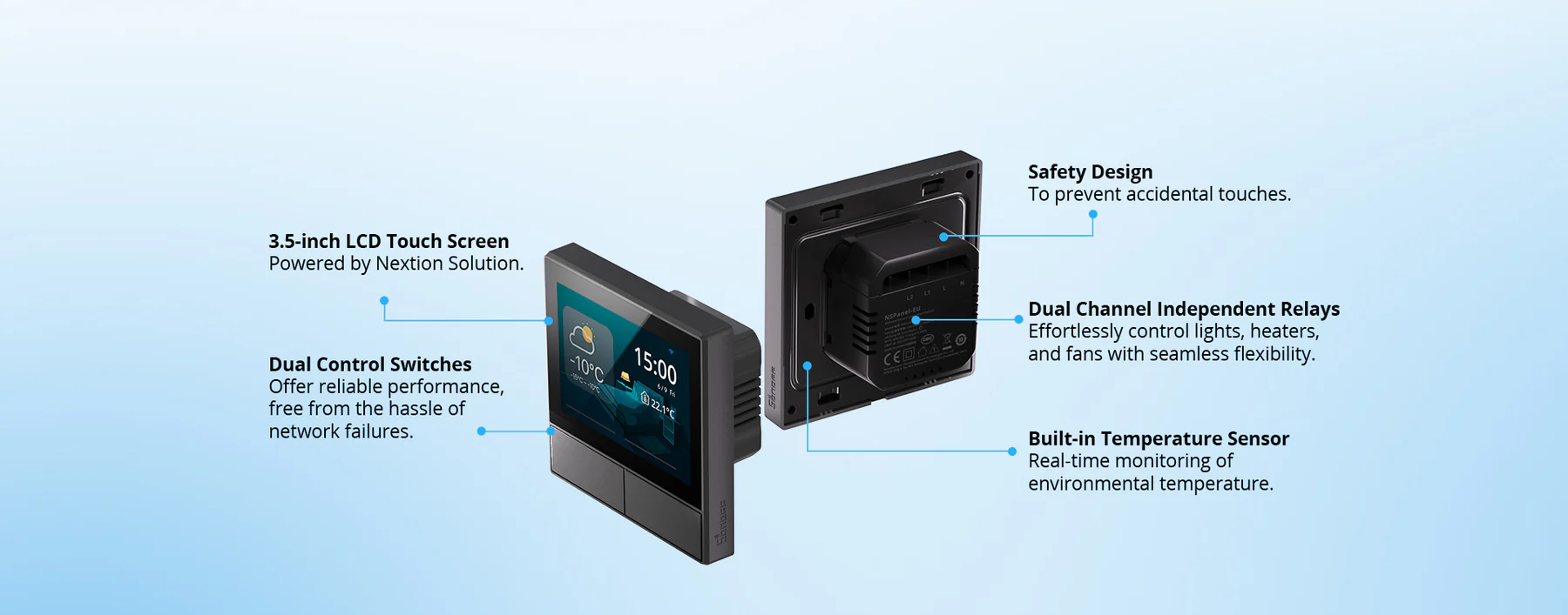【Flexible Control Options】Control NSPanel via dual-channel switches, the touchscreen, or the eWeLink app. It also supports Alexa, Google Assistant, Alice, and Siri Shortcuts for effortless voice control.