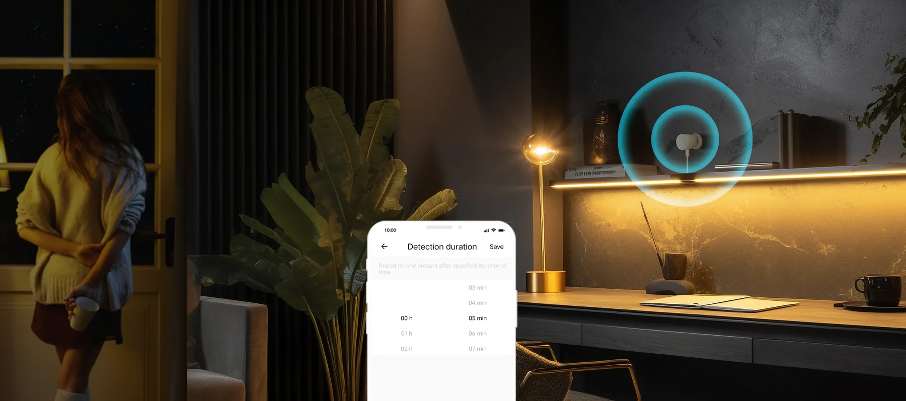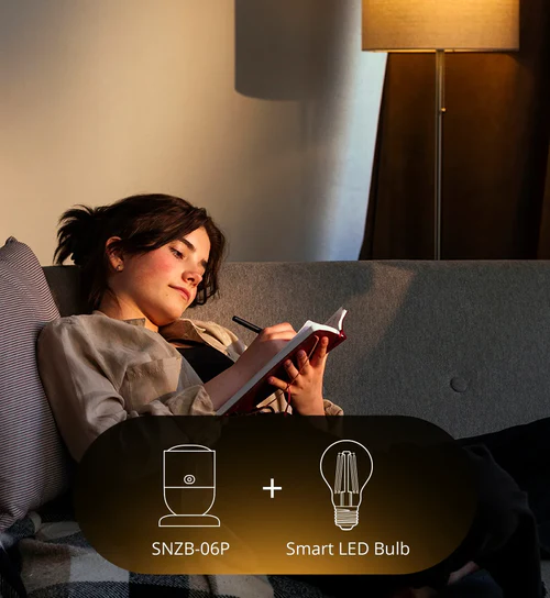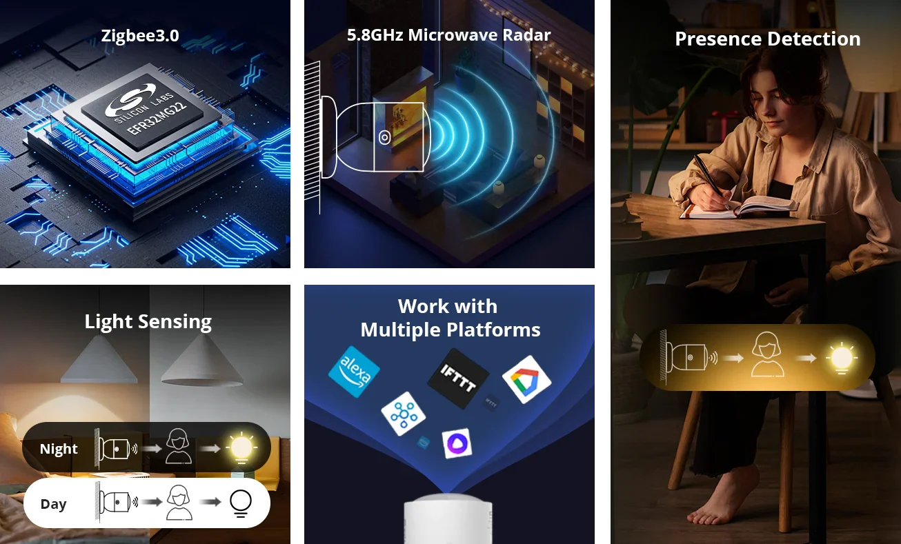 【Presence Detection】SNZB-06P utilizes 5.8GHz microwave radar to detect both moving and stationary individuals. It automatically turns on lights when you approach and keeps them on until you leave.