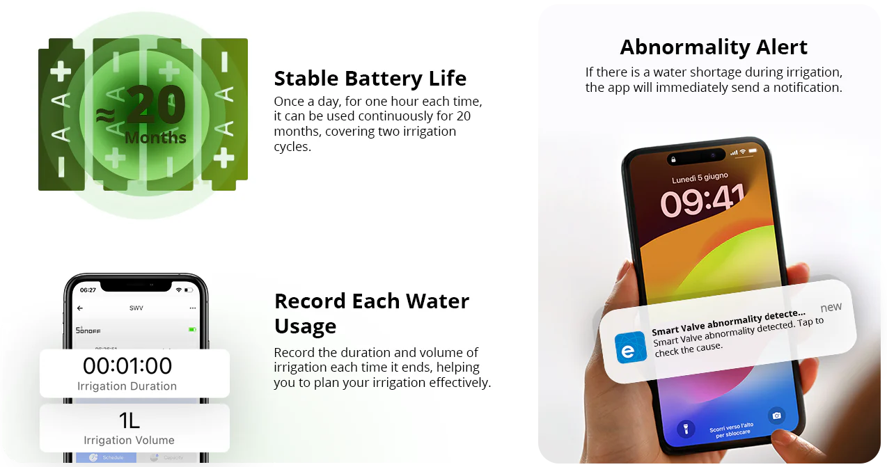 【6-Month Historical Data】View up to 180 days of water usage and irrigation duration via the app. Analyze daily, weekly, or monthly data to optimize watering and reduce water bills.