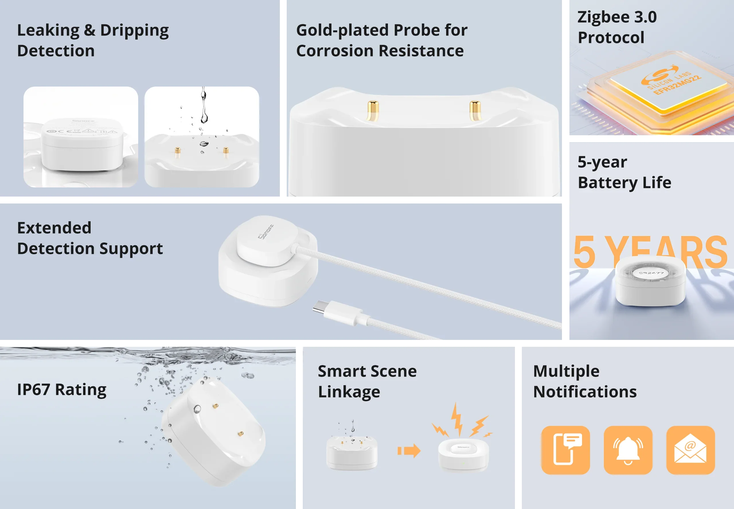 【Real-time Alerts & Multiple Notifications】Instant app push notifications alert you immediately upon water detection. Zigbee local scenes can trigger gateway alarms even during WiFi outages.